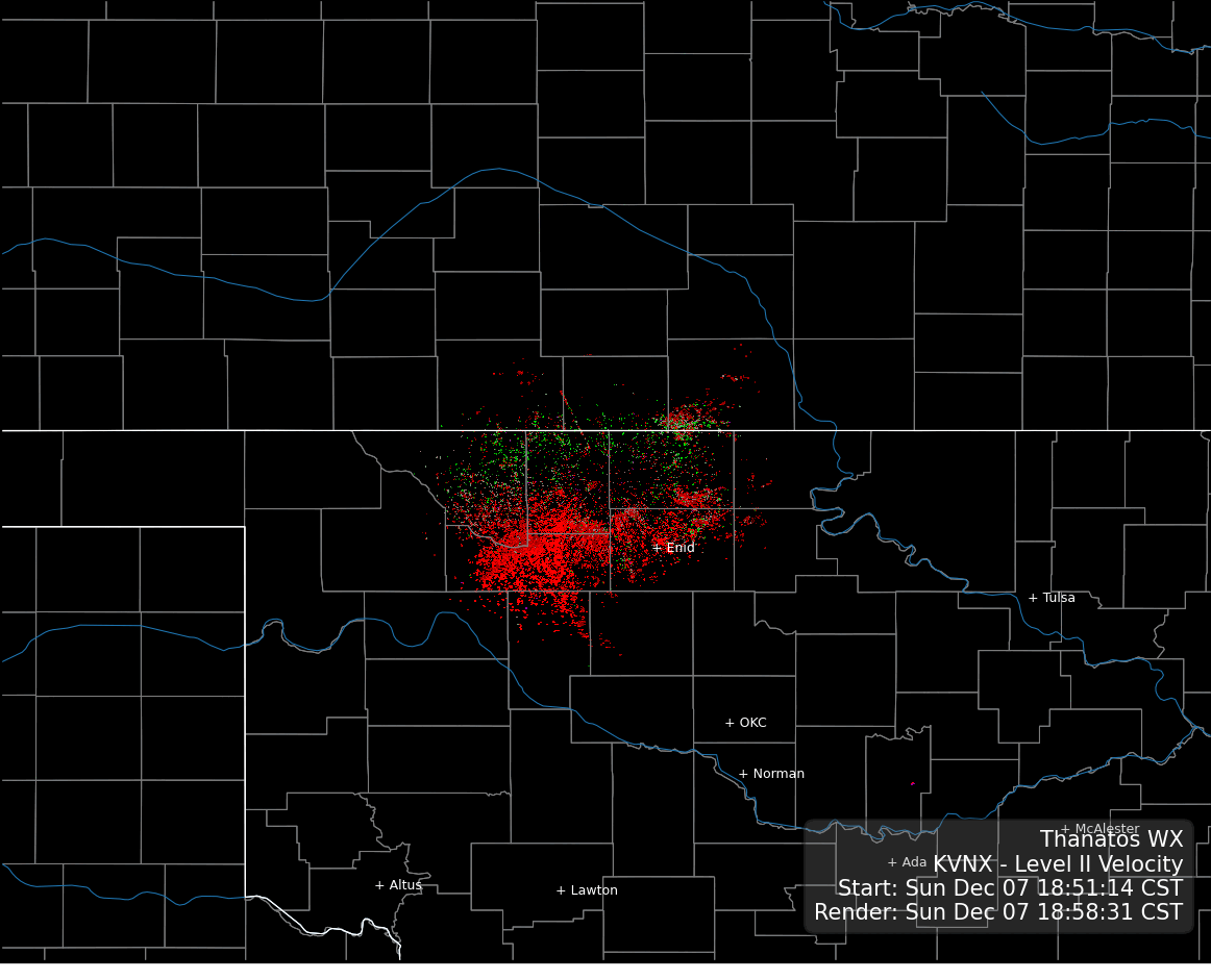 - A measure of the radial component of the wind either toward the radar (negative values) or away from the radar (positive values). Cool colors (green) represent negative values and warm colors (red) represent positive values.